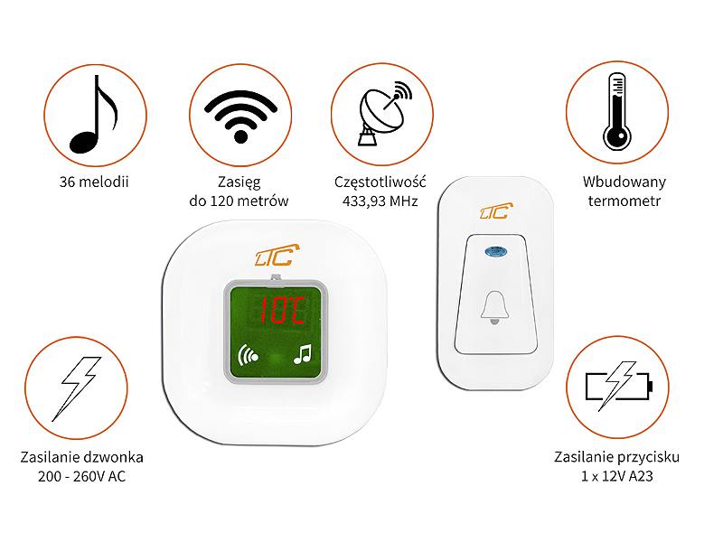 Urządzenie dzwonkowe z przyciskiem komunikuje się za pomocą transmisji radiowej o częstotliwości 433.93 MHz co gwarantuje zasięg do 120 metrów w idealnych warunkach terenowych. Możliwość wyboru spośród 36 melodii pozwala na spersonalizowanie dzwonka według upodobań użytkownika.