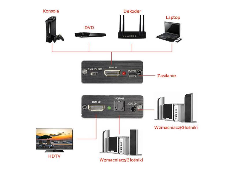 Wysokiej jakości urządzenie, słuszące do wyodrębnienia sygnału audio. Extractor stanowi urządzenie pośredniczące między telewizorem, a urządzeniem wysyłającym sygnał audio. Dzięki takiemu rozwiązaniu użytkownik jest w stanie przekazać przesyłany dźwięk np. do systemu kina domowego, bądź innego urządzenia audio. Dzięki amplitunerowi dźwięk może być słyszalny jednocześnie z głośników telewizora i zewnętrznego urządzenia odtwarzającego. Extractor audio HDMI to świetnie rozwiązanie dla osób chcących mieć kontrolę nad tym kiedy i z jakiego urządzenia sygnał audio ma zostać odtworzony.