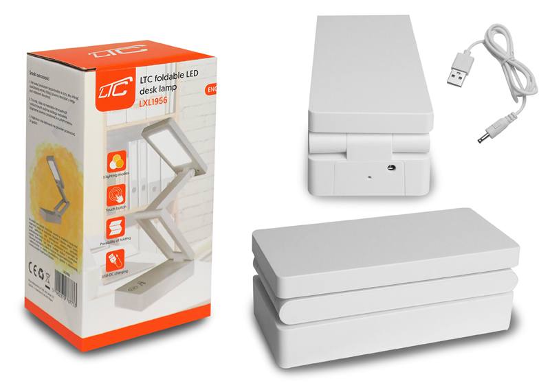 Lampka biurkowa LTC LED 3W, 3 barwy światła 3000/4000/6000K, panel dotykowy, akumulator 1200mAh, składana, biała