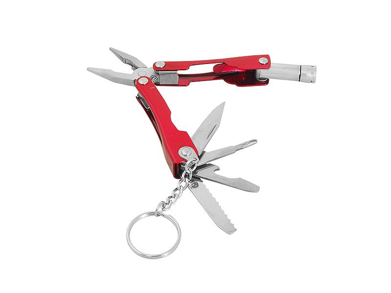 Multitool stalowo-aluminiowy z latarką, czerwony.