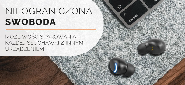AS31 to słuchawki prawdziwie bezprzewodowe — każda ze słuchawek jest oddzielnym urządzeniem — nie są ze sobą połączone żadnym przewodem. Taka konstrukcja zapewnia najwyższą możliwą swobodę i komfort użytkowania. Ze względu na to, że słuchawki są odseparowanymi urządzeniami, możesz korzystać jedynie z jednej słuchawki, a nawet sparować każdą z nich z innym urządzeniem!