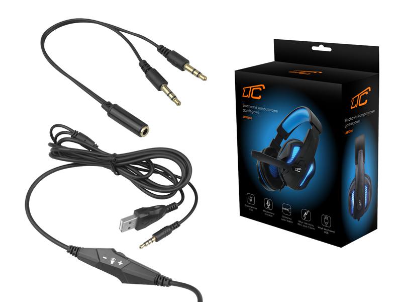 Słuchawki komputerowe gamingowe LTC, wejście mikrofonu Mini-Jack 3.5mm, wejście słuchawek USB, regulacja pałąka/głośności, kabel 2m