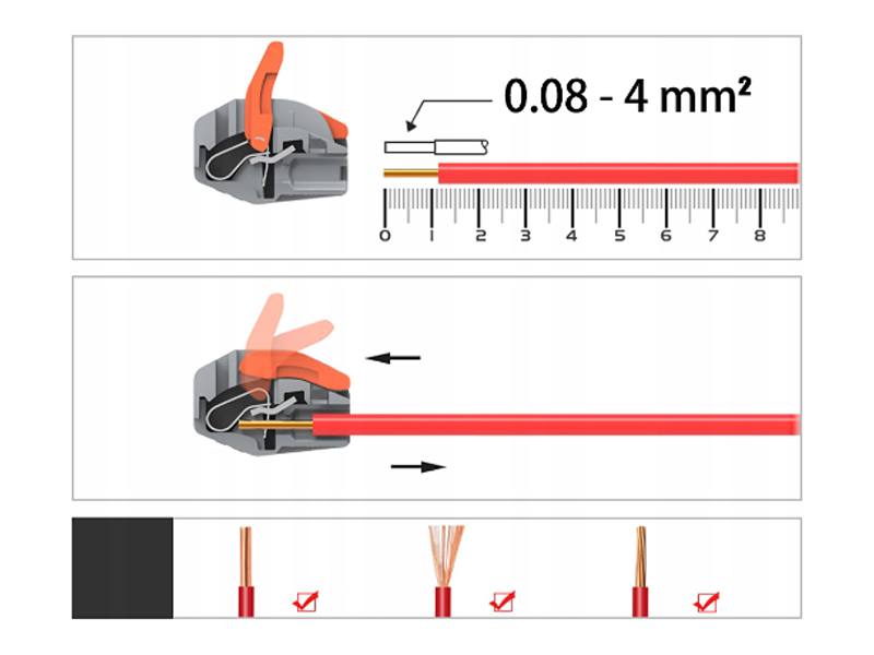 Złączka przeznaczona do łączenia przewodów w instalacjach elektrycznych oraz łączenia kabli linkowych i drutowych.