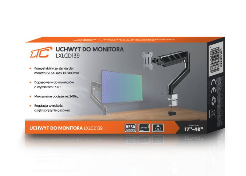 Do uchwytu LTC LCD139 możesz podłączyć monitor w rozmiarze od 17 cali do 40 cali. Maksymalna waga monitora, jaką możesz zawiesić na uchwycie wynosi 10 kilogramów. Zyskujesz również możliwość odchylenia monitora pod kątem -70°/+45° w płaszczyźnie góra/dół oraz -90°/+90° w płaszczyźnie lewo/prawo.W zestawie znajdziesz elementy potrzebne do zamontowania uchwytu zarówno do krawędzi biurka, jak i przy pomocy otworu w blacie. Uchwyt oferuje wsparcie dla standardów VESA 100 x 100 mm. Przewodami monitora będziesz mógł zarządzać dzięki specjalnym uchwytom.