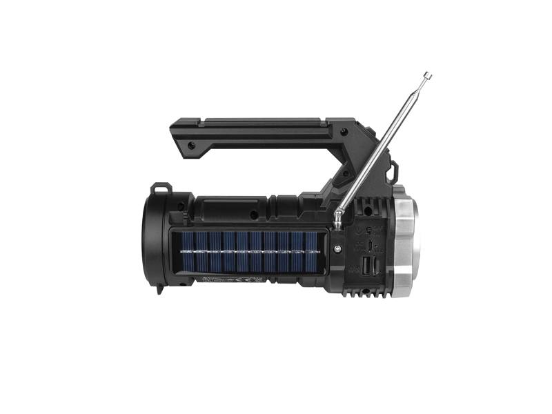 Latarka wielofunkcyjna, typu szperacz z wbudowanym radiem, głośnikiem bluetooth i panelem solarnym. Jest to wyjątkowe urządzenie, które znajdzie zastosowanie szczególnie na biwakach i wyjazdach plenerowych, zapewniając awaryjne źródło światła oraz dostęp do rozrywki.